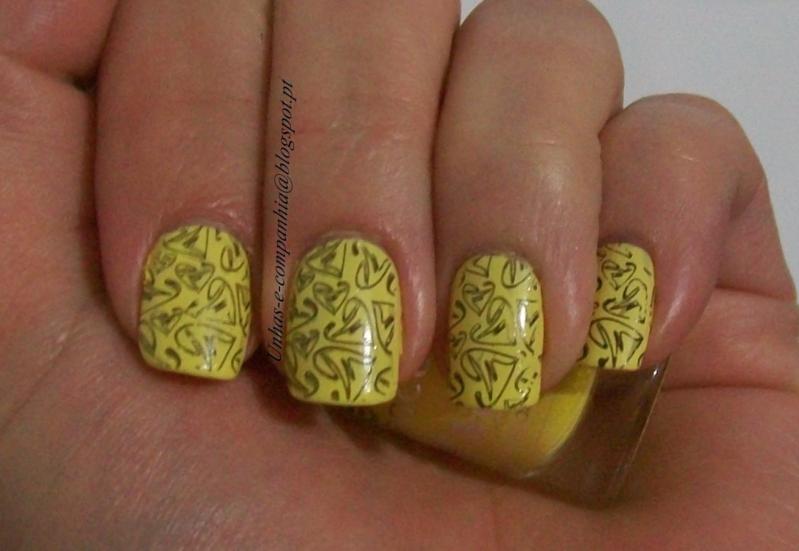 Este verniz comprei-o mas para pintar as unhas da minha filhota pelo Carnaval como ela ia de abelhinha :) mas como achei-o tão fofo decidi também experimentá-lo em mim, (pintei no dia 12 de junho) apliquei duas camadas como de costume e logo a seguir fiz a minha cheekycure  em preto com estes corações que adoro.